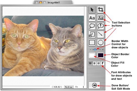 Click the Cloud, Balloon, Label, Arrow, Square, or Circle button to insert a Draw Object. Move the mouse to position the object on the image; then click the mouse again to drop the object at that location. Double click on an object to insert or edit the text in the object. The font can be changed by highlighting the text and clicking the Font button to pop open a standard Aqua Font panel. The text alignment can also be changed by highlighting the text and choosing one of the three alternatives: left, center, or right.
