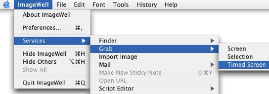 3) Services Menu: Three Grab options are available under ImageWell-Services-Grab: Screen Grab, Screen Selection, and Timed Screen Grab. Unlike the first two methods above, this option will activate Apple's screen grab utility.