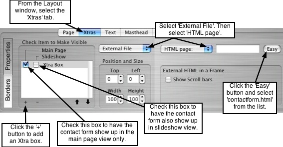 Select the Xtras tab and click the '+' symbol to add an Xtra box for your contact form.
