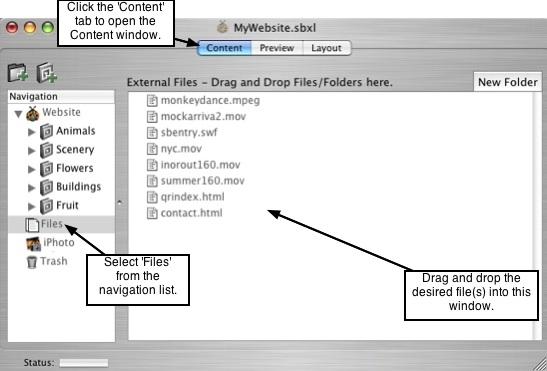 to open the Content window. Select the "Files" heading located at the bottom of the