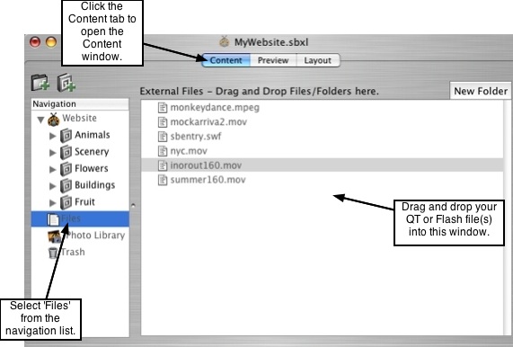 Adding a QuickTime or Flash file require both the Content window and the Layout