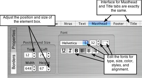 options under the Masthead and Title tabs allow you to edit the following properties: