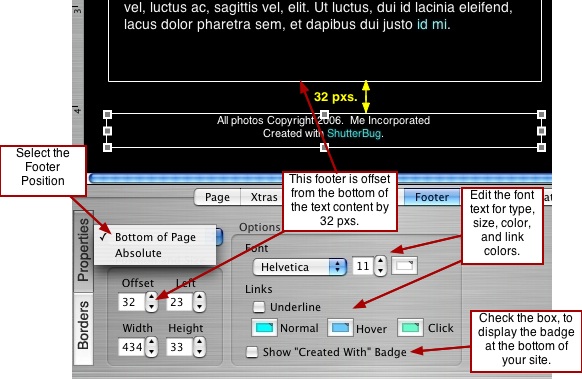 Content window. You can edit the font, edit the links, reposition and resize the footer