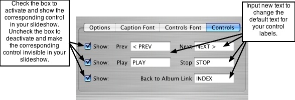 To make these controls invisible on your slideshow, uncheck the corresponding Show