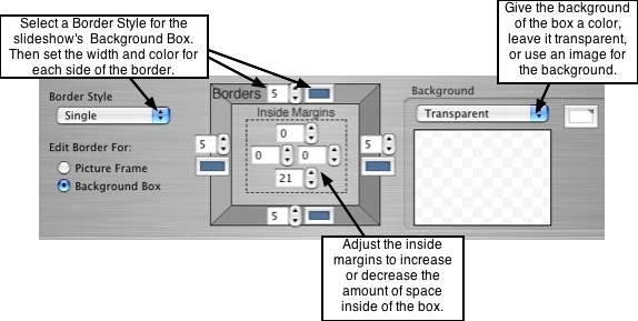 options apply to the slideshow pictures, while the Background Box options apply to the