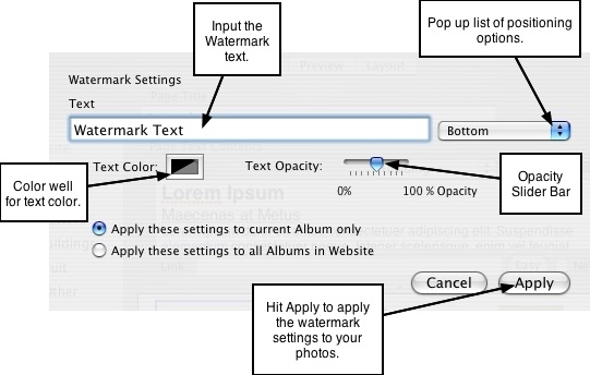 Watermarks get applied to either all photos in an album or all photos in your entire