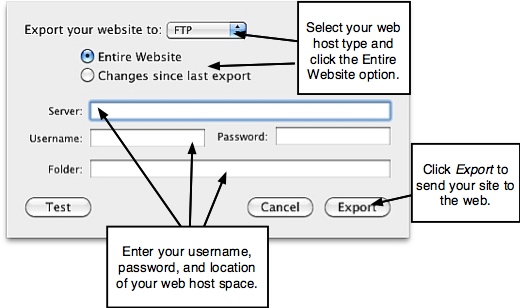 preview your site, test your links, and export the site to the web or a folder on your